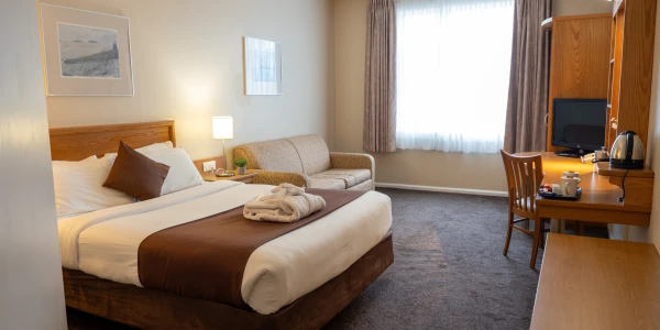 There's also a complimentary bathrobe in your room, plus home away from home services like our guest laundry room, ice buckets, and ice machine, which you can help yourself to. There is also free entry to our small exercise room. 24-hour room service is also available.