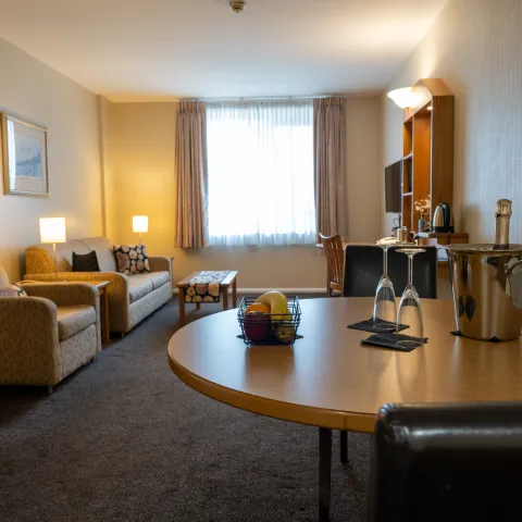 The King Suites are twice the size of our twin rooms. Each King Suite has a large bedroom with a King sized bed and a separate living room with a sofa, which can be changed into a bed. Meaning the room can sleep up to four guests. An exclusive welcome pack will be waiting for you in your room, which includes a bottle of Cava, a bowl of fresh fruit and large bottles of chilled still and sparkling water.
